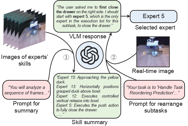 Our system leverages a VLM for high-level task planning in two stages. First, at the skill summarization (①) stage, the VLM builds a textual knowledge base of the robot’s capabilities by analyzing annotated frames from a demonstration that follows the same execution sequence as the training data. Second, at the task execution stage (②), the VLM uses this knowledge, a high-level goal, and a real-time image to reason about the current task stage and predict the appropriate expert to activate. This hierarchical architecture enables the system to dynamically plan and rearrange the order of subtasks without any re-training, translating abstract goals into concrete robotic actions.